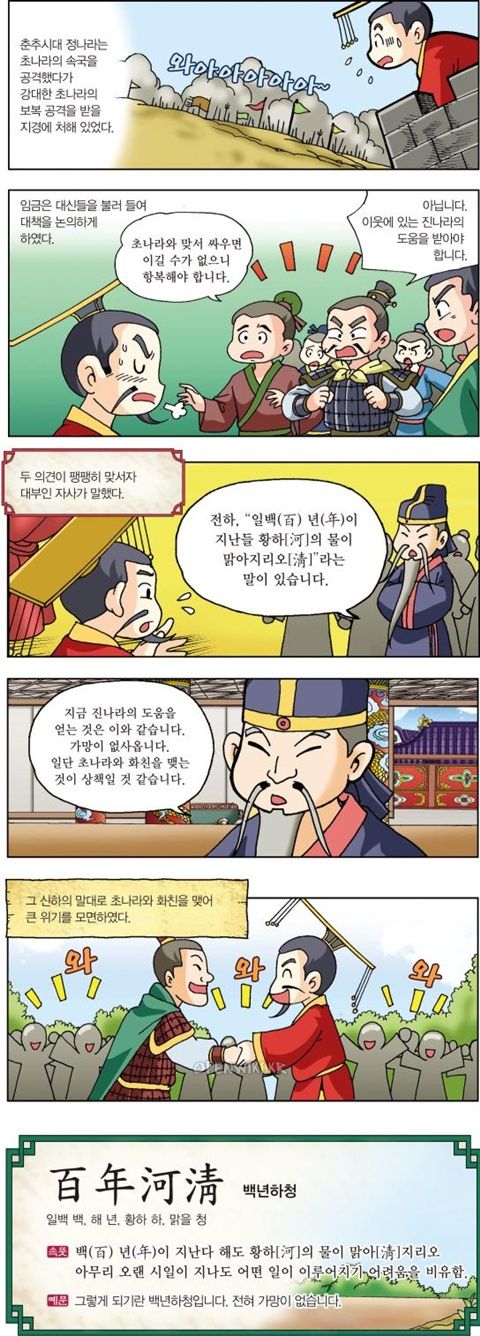 "주나라의 시에 '황하의 흐린 물이 맑아지기를 기다린다 해도 인간의 짧은 수명으로는 아무래도 부족하다'는 말이 있듯이, 지금 진나라의 구원군을 기다린다는 것은 '백년하청'일 뿐이오. 그러니 일단 초나라에 복종하여 백성들의 불안을 씻어 주도록 합시다."