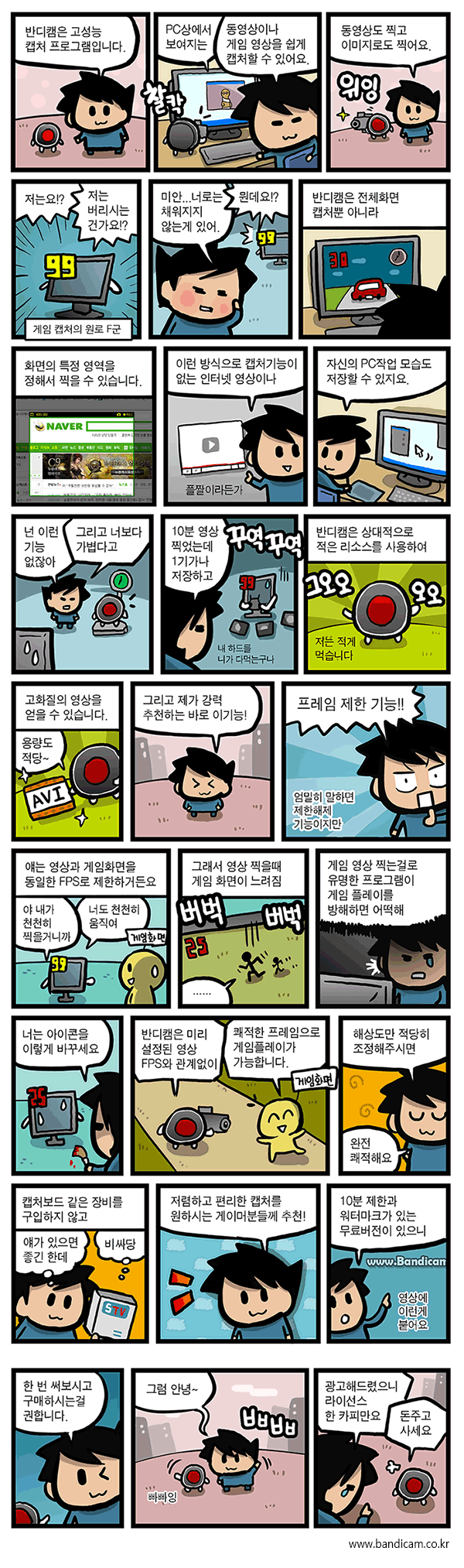 반디캠(Bandicam)은 온라인 게임 녹화(아이온,스타2,메이플,던파…)나 컴퓨터 화면 녹화(네이버 동영상,곰TV,파워포인트,엑셀,강의) 등을 할 수 있는 프로그램이다.