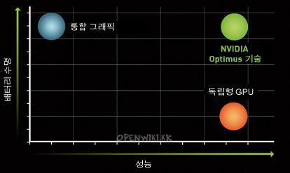 요즘 인텔시퓨들은 그래픽프로세서 (IGP) 가 내장되어 있습니다. nVIDIA Optimus 기술이 적용된 애런데일 플랫폼 기반 노트북은 GMA HD 내장그래픽과 nVIDIA 의 외장그래픽을 유동적으로 조절(Switchable Graphics)이 가능하게 됩니다.